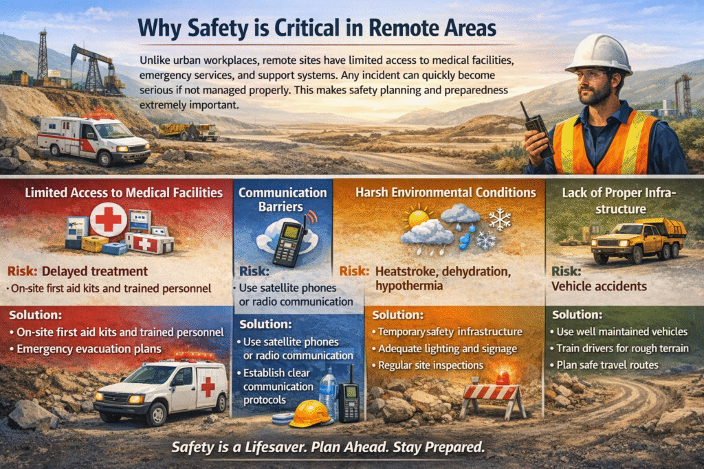 Unlike urban workplaces, remote sites have limited access to medical facilities, emergency services, and support systems. Any incident can quickly become serious if not managed properly. This makes safety planning and preparedness extremely important.